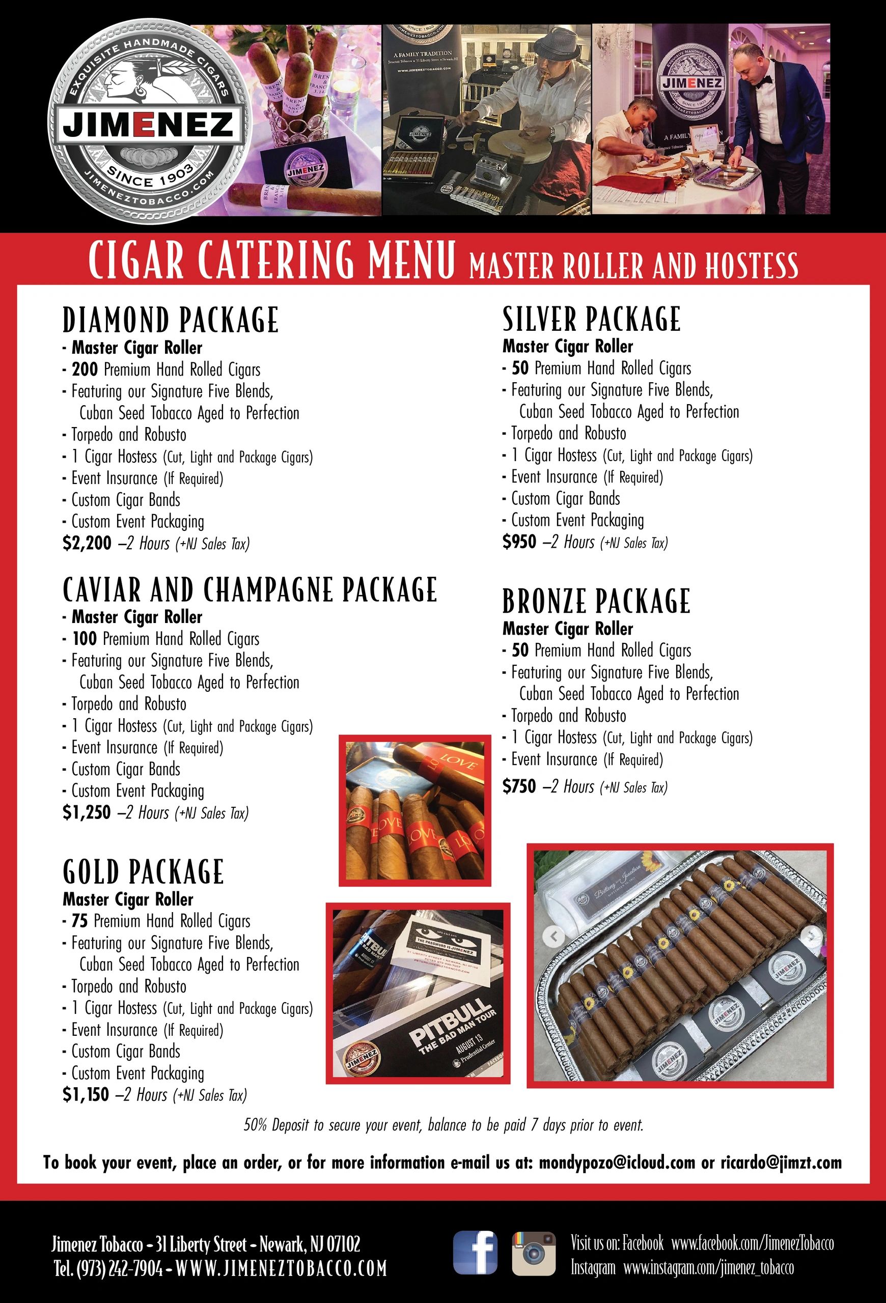 We go above and beyond to provide an extraordinary experience for our clients by offering a range of exceptional services. Our catering services are designed to elevate any event, whether it's a wedding, corporate gathering, birthday celebration, golf outing, or private event. One of our unique offerings is the option to have hand-rolled cigars prepared onsite, delighting guests with the artistry and craftsmanship of our experienced rollers. This personalized touch adds a special element to your event, creating lasting memories for all in attendance. Additionally, we understand the convenience of online shopping, and thus provide a seamless cigar purchase experience through our online platform. You can explore our extensive selection of premium cigars from the comfort of your own home and have them delivered directly to your doorstep.